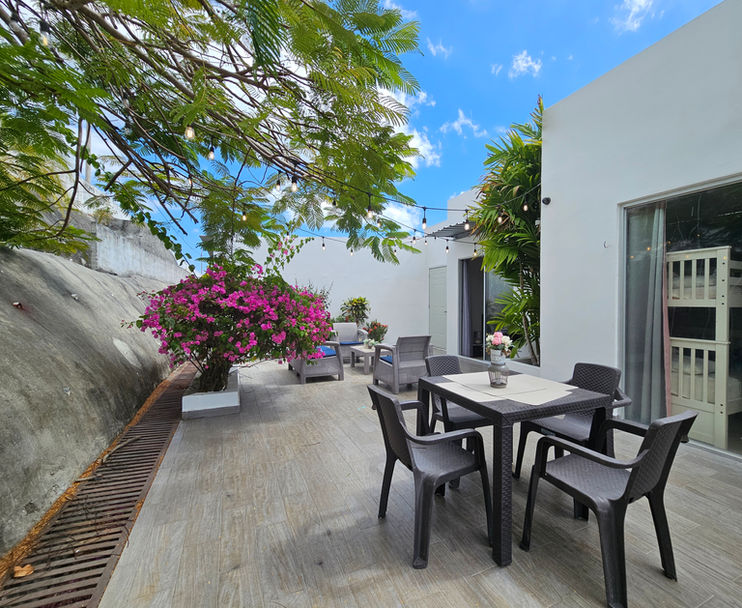 En la parte trasera, encontrará un agradable patio ideal para relajarse, disfrutar comidas al aire libre o recibir invitados. Este espacio añade un gran valor tanto para el disfrute personal como para el atractivo en alquileres vacacionales.