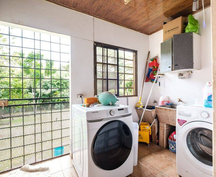 3 bedrooms upstairs, two bathrooms, a balcony; 1 bedroom downstairs with its own bathroom, enclosed laundry area, spacious teak kitchen, dining room, living room, study, terrace, rear storage room, fenced in the back and on the sides.Security service available 6 days a week.